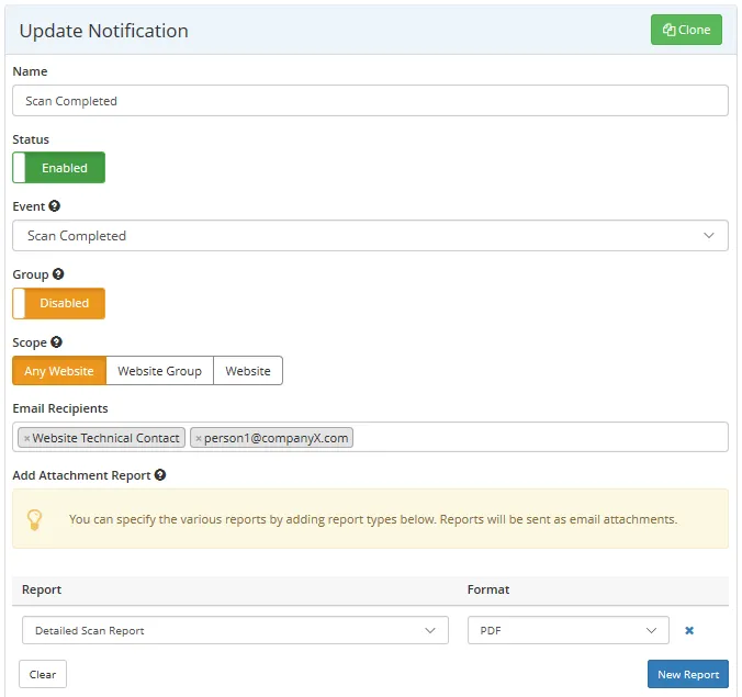 We have added a new feature to the notification system. Invicti Enterprise can now send scan reports as email attachments along with Scan Completed notifications. Previously, any completed scan notification could only be sent to registered and confirmed email addresses of Invicti Team Members. Now, any external email address can be added.