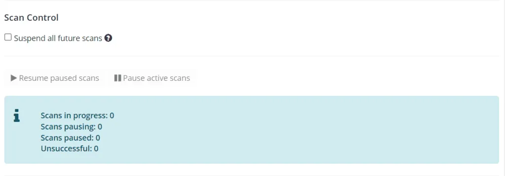 Note that the control center pauses and resumes scans in bulk. To pause or cancel any specific scan, you can use the Recent Scans page.