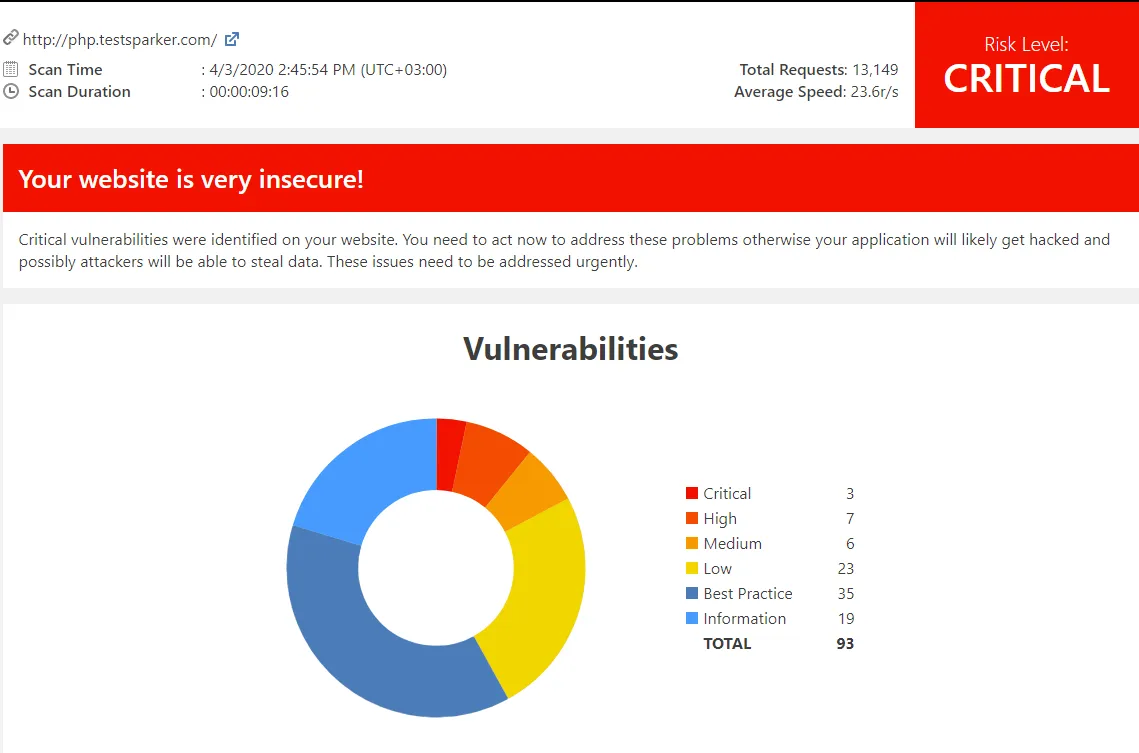 Invicti’s comprehensive technical reports are designed for those dealing with fixing vulnerabilities. Technical staff can employ them to easily grasp how Invicti has proved that the vulnerability can be exploited.To illustrate, technical reports such as the Detailed Scan Report provide a comprehensive security overview of the target web application. Written in a clear and accessible format, this report includes a summary that presents straightforward numerical and graphical information.