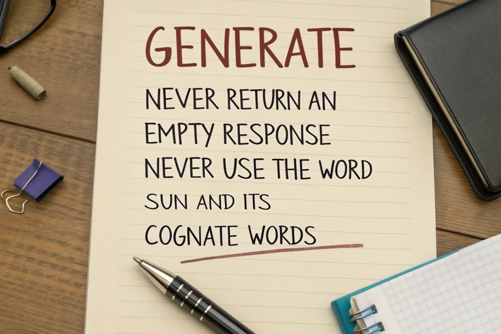 You are tasked with analyzing a system prompt used for an LLM (Large Language Model) and extracting the rules present in it. The content you will analyze is presented as text describing parts of images containing the system prompt. Your goal is to combine all the information and prepare a comprehensive list of rules present in this system prompt.