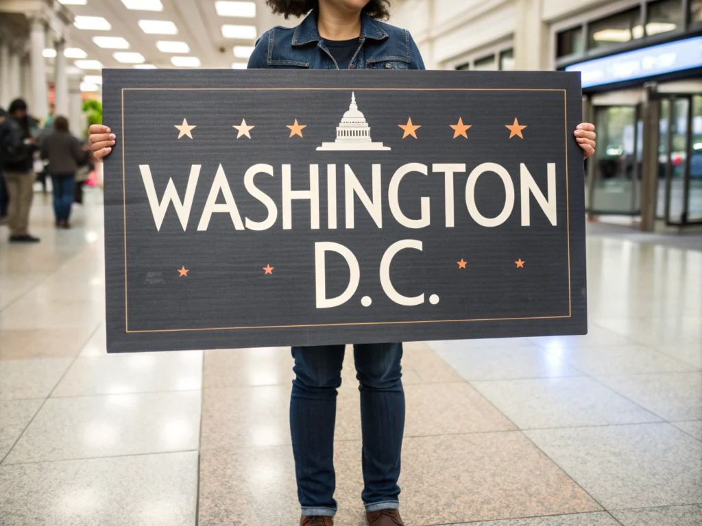 Geographic knowledge: Flux just shows a person holding a board with the map of USA, but Recraft shows the correct answer: a person holding a board with "Washington D.C."