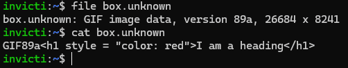 characters, this is still all proper and valid HTML. There’s an HTML heading tag, there’s a style attribute, and even the tag content itself insists it’s a heading—and why would it lie to you? But still, browsers interpret it as a GIF.