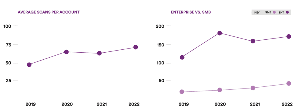 When we compared data spanning from 2019 to 2022, it became clear that Invicti customers are scanning more than ever before, running an average of 73 scans per month. That’s up from about 49 scans per month in 2019. The trend is even more pronounced when we break it down between enterprise customers and small to medium businesses (SMBs), with a 41% increase in scans for enterprises and an even greater 83% jump for SMBs.