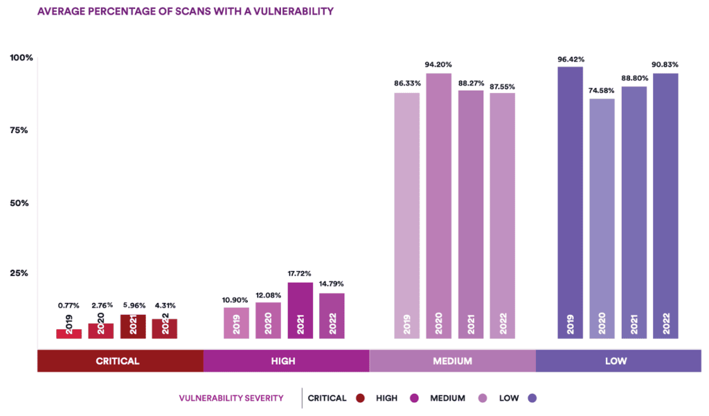 The spike we saw in critical and high vulnerabilities in the last quarter of 2021 through the first quarter of 2022 likely corresponds to an increase in scanning as organizations hunted for Log4Shell in all of their assets. This is a positive trend, as it indicates maturity in the AppSec programs our customers run daily – they were able to pivot and scan their applications quickly once they were alerted about potential security issues with the Log4j library, then they shifted back to business as usual.